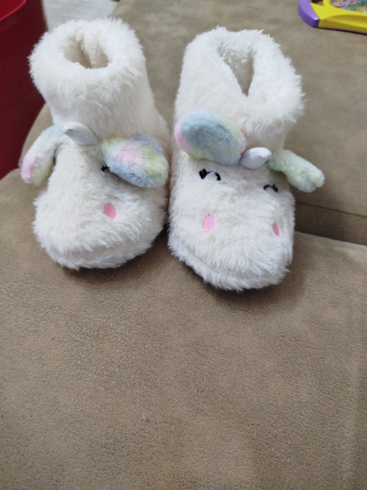 Kız çocukları için beyaz peluş, kürklü ve pastel işlemeli desenlere sahip sıcak ev terliği. 21-22