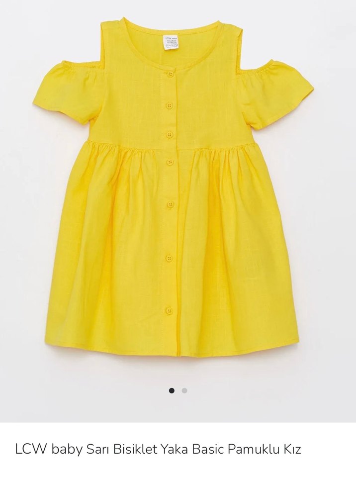 Hediye geldi hiç giyilmedi yıkayıp kaldırmıştım şu an bize büyük geliyor zaten giyemez de . Pamuklu rahat tam kalıp kusursuz Sarı renkli kız çocuk elbisesi, kısa kollu, düğmeli ve keten kumaştan üretilmiştir. Straplez yakalı ve bol kesimdir, bohem tarzındadır.