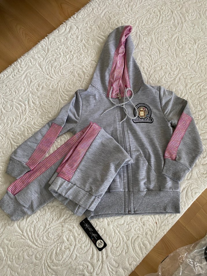 Gri kapüşonlu, nakışlı ve fermuarlı kız çocuk eşofman takımı. Uzun kollu ve pembe çizgili detaylı, yumuşak ve sıcak kumaştan üretilmiştir. Trendy rahat stil için uygundur.
