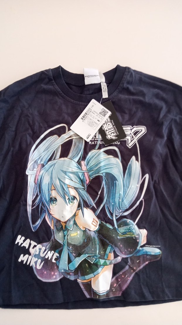 Koyu mavi renkli, sentetik kumaştan üretilmiş, baskılı Hatsune Miku desenli, kısa kollu ve bisiklet yaka, bol kesim kız çocuk tişörtü. 9.10yaş