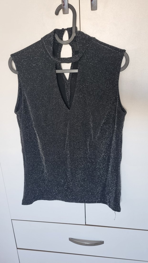 Siyah, sıfır kollu, V yakalı, payetli ve mini uzunlukta, şık bluz. ✨