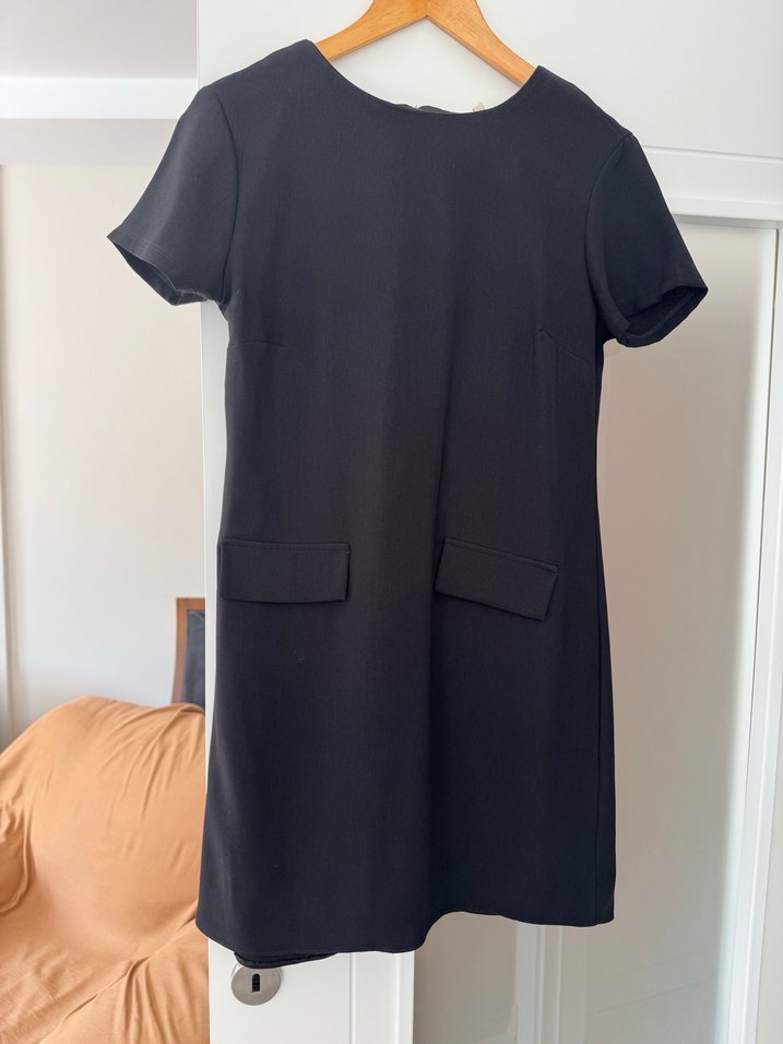 Siyah midi elbise, kısa kollu ve yuvarlak yakalıdır. Düz ve rahat kesim, ofis kullanımı için uygundur. ✨Boy 85 cm iki koltuk arası 45 cm