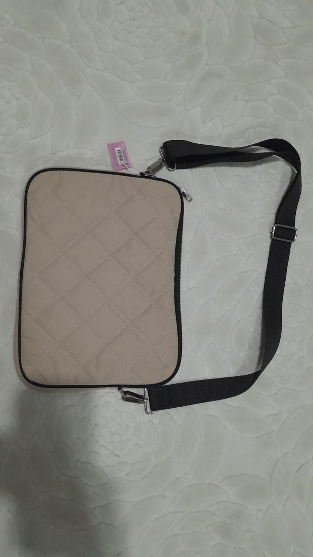 Sıfır hiç kullanılmadı etiketli Fermuarlı kapanışa sahip, bej yumuşak kumaştan laptop çantası. Gri ayarlanabilir askısı ve desensiz sade tasarımı