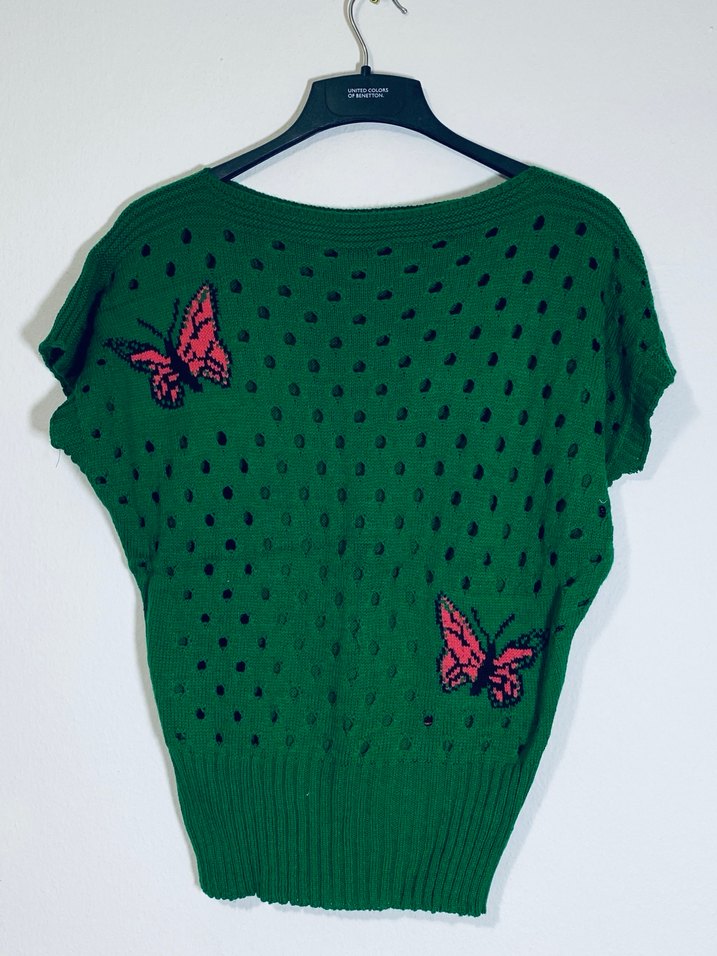 Sıfır - Düşük kol triko bluz - hediye geldi hiç giyilmedi (Code 461) Yeşil renkli, nakışlı kelebek desenli örgü kadın kazak. Kısa kollu, yuvarlak yakalı, bol kesim ve rahat bir dış mekan stiline uygun.