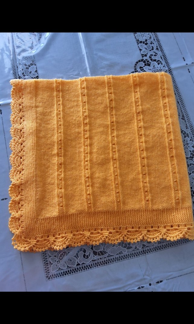 Birinci sınıf Nako Rekor ip ile örülmüştür. Tüylenme yapmaz, bebek cildi için uygundur ve oldukça yumuşaktır. Ölçü: 80x80 cm (Bebek arabası, puset ve beşik için ideal boyut). Modern çizgili örneği ve el işçiliği kenar oyası ile çok şık bir görünüme sahiptir. Hardal sarısı rengiyle hem kız hem erkek bebekler için uygundur (Unisex)Hiç kullanılmamış, sıfır üründür.