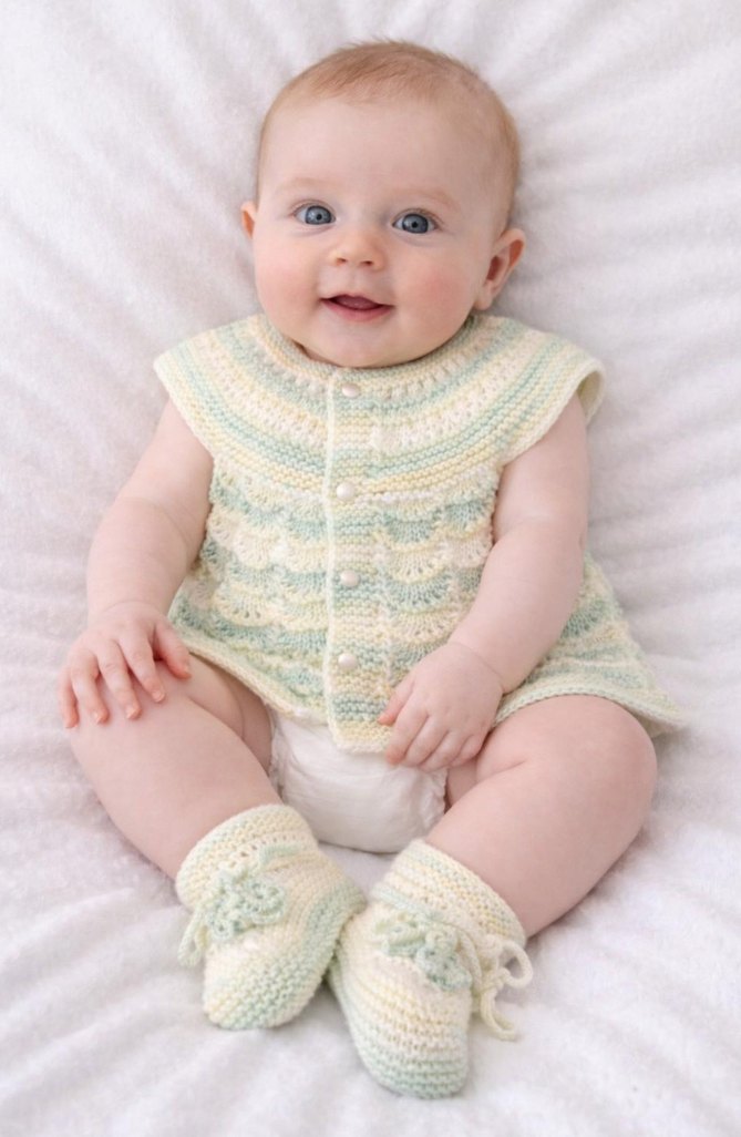 Pastel çok renkli, düğmeli üst ve eşleşen patiklerden oluşan, yumuşak dokulu örgü bebek yelek takımı, kolsuz tarzda.
