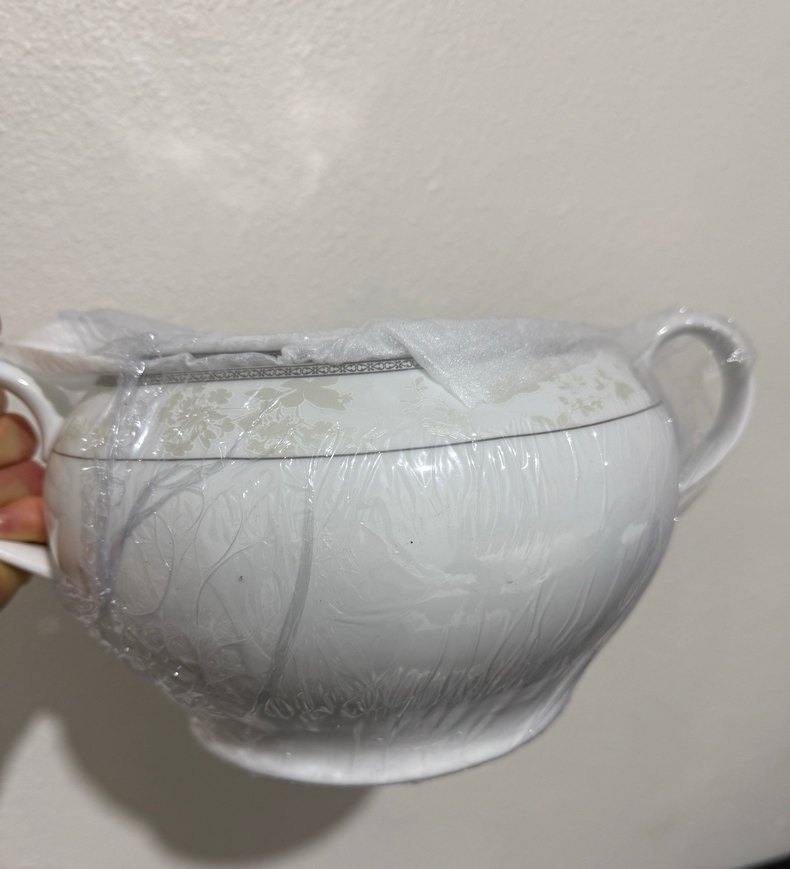 Gri tonlarda, desensiz ve sade tasarıma sahip beyaz porselen çorba tenceresi sıfır poşetli sorunsuz Günlük ve özel kullanım için uygundur aynı gün kargo