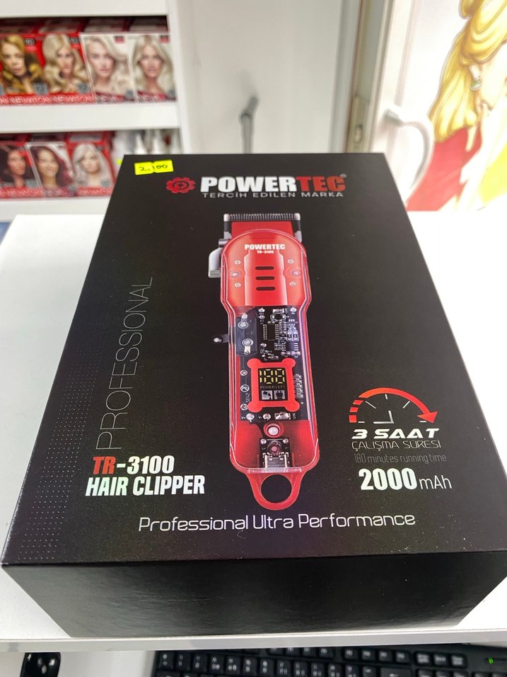 Powertec TR-3100 saç kesme makinesi, 2000mAh batarya ile 3 saate kadar kullanım sunar. Canlı kırmızı renkte, profesyonel ultra performans sağlar. ✂️ MODEL TR-3100