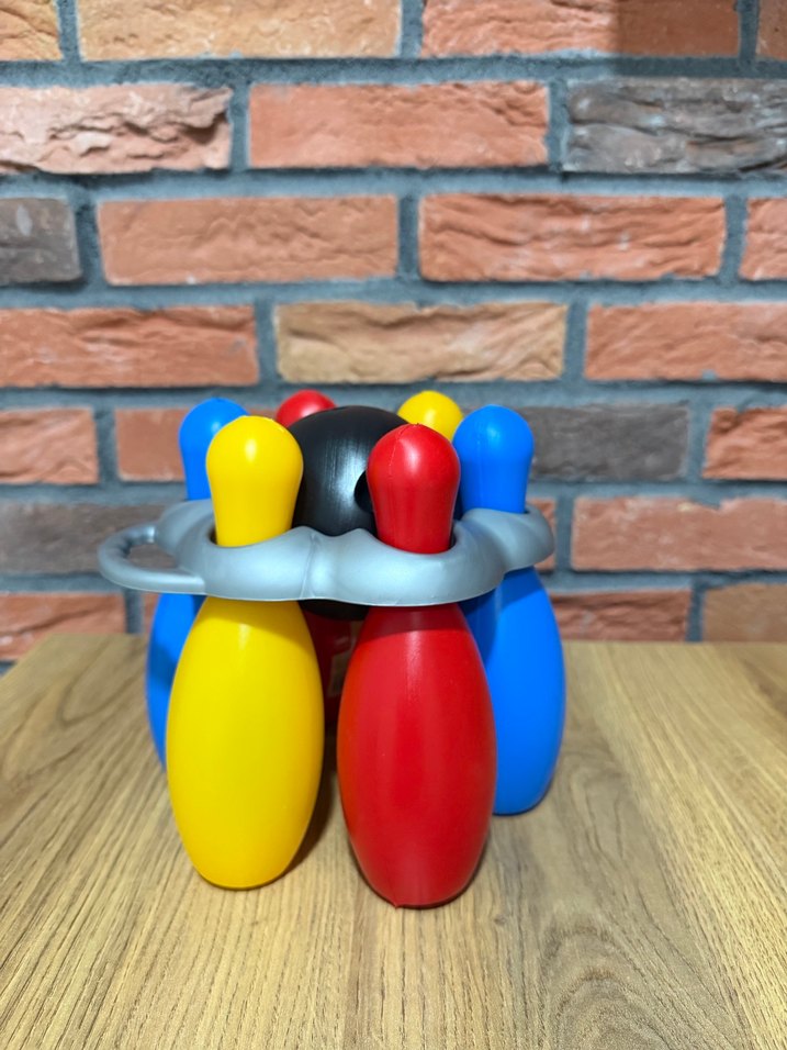 Altı renkli top ve pimden oluşan mini bowling seti, taşıma sapı ile pratik kullanım sağlar. Hiç kullanılmamıştır.