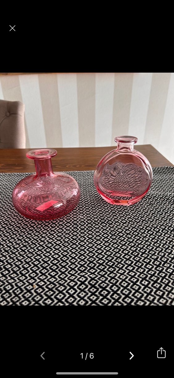 Farklı şekillerde, renkli pembe camdan yapılmış adet vazo. SIFIR ETİKWTLİ