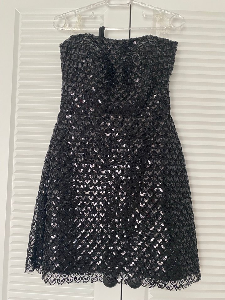 Siyah, straplez, dantel detaylı ve yılan kalp desenli, fitted kesim midi elbise, gotik tarzda parti için uygundur.