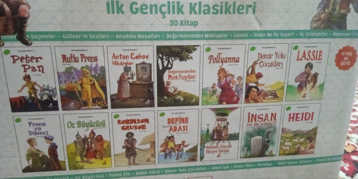 tertemizdir 30 lu seti ilk gençlik klasikleri herhangi bir deforme ezik çizik herhangi birşey yoktur birkaçında sadece öyle içeriğe bakmak için açılmıştır harici tertemiz kapağı bile açılmamış kitaplardır almak isteyenler için yardımcı oluruz Kitap Hakkında: Dede korkut hikayeleri, Mesneviden seçmeler, Karagöz ile hacivat, Vatan yahut silistre, Altın ışık, Yalnız Efe, Türk yazarlarından seçme hikayeler, Safahattan seçmeler, Anadolu masalları, Denizaltında 20.000 fersah, Alis harikalar diyarında, Güliverin gezileri, Robin Hood, Tom Sawyer Üç silahşorlar, Pinokyo, Peter Pan, Mutlu prens, Anton Çehov hikayeler, Değirmenimden mektuplar, Pollyanna, Demir yolu çocukları,Lassie, Prens ve dilenci Oz büyücüsü Robinson Crusoe, Define adası, Seksen günde dünya gezisi, İnsan ne ile yaşar, Heidi 0