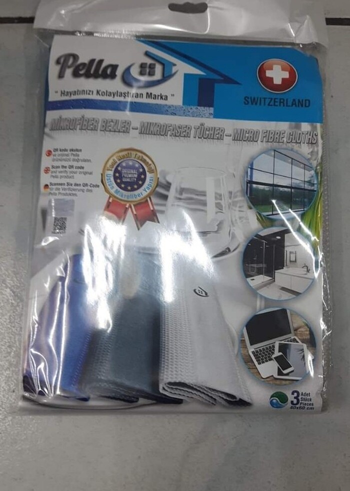 Orjinal PELLA eu; mikrofiber cam bezi; duruma kurulama gerektirmez; suyla sil geç. Pakette 3tane var