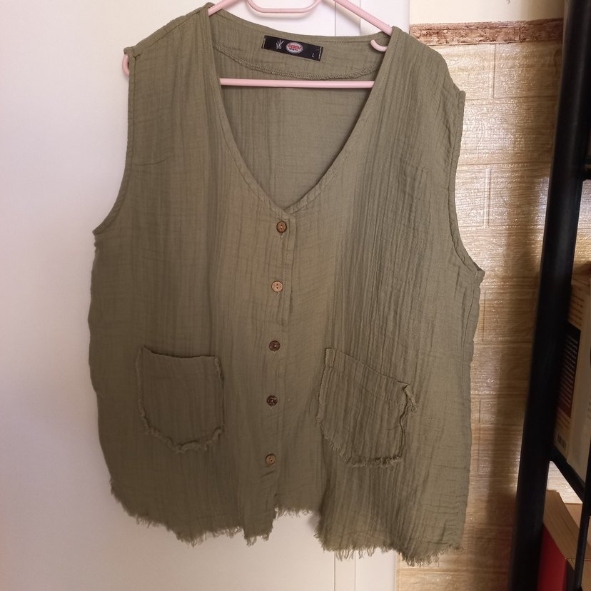 Hediye geldi. beden uynadı, hiç giyilmedi. butik ürün. Düğmeli, V yakalı, bürümcük, keten. çağla yeşili. iki cepli, kolsuz kadın yeleği. Günlük kullanıma uygun bohem tarzda. iki kol arası 55 cm, omuzdan boy 62 cm.