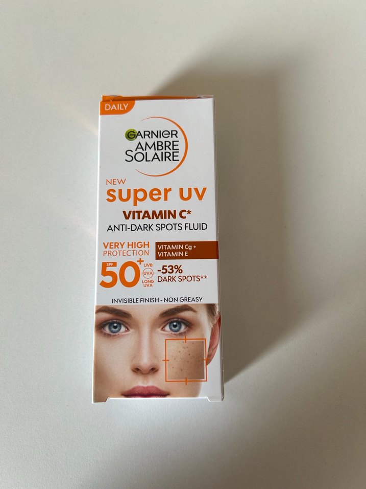 Kasım ayında aldım hiç kullanılmadı. Garnier Ambre Solaire Super UV sıvı, SPF 50 ile çok yüksek güneş koruması sağlar. C ve E vitamini içerir, koyu lekeleri %53 azaltmaya yardımcı olur, görünmez ve yağsız bir bitiş sunar.