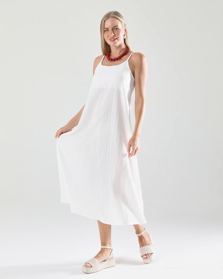 Ürünlerim sıfır etiketli ürünlerdir Small ve medium bedenleri kaldı Kadınlar için beyaz, uzun keten görünümlü krinkıl elbise; askılı, bol kesim ve tek renk. Minimalist, bohem tarzda, günlük kullanıma uygun. Ürün markası Chago