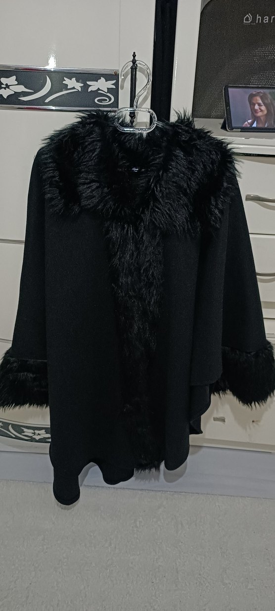 siyah kaban, yumuşak ve sıcak kumaştan, yakası ve manşetleri kürklü, notched lapel yakalı ve bol kesimdir. SIFIR URUN. HEEER BEDENE UYGUNDUR. GENİŞLİĞİ/SALAŞLIĞI FOTOLARDA MEVCUT. 44 46 BEDENDEN 60 BEDENE KADAR OLABİLECEK SALAŞLIKTADIR. MAĞAZA FİYATİ 1700 TLDİR. COK COK UYGUNA YAYİNLİYORUM