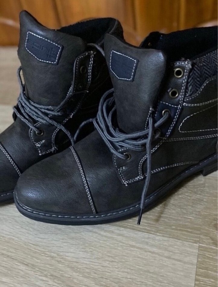 Fransadan hediye geldi 46 numara fakat kalıbını tam bilmiyorum 32 cm civarıdır koyu gri eskitme detaylıdır. rkemer detaylı ve bağcıklı erkek goth botu, desen içermeyen yüzeyiyle sokak stiline uygun.