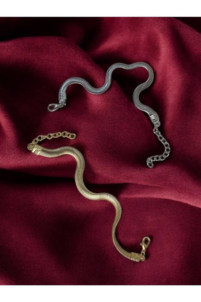 Altın ve gümüş renklerde, yılan desenli ve zincir detaylı kadın el zincirleri, günlük kullanıma uygun. #Gardrops #GardropsSatış #GardropsDolabım #DolabımdanSatıyorum #İkinciElStil #StiliniYarat #Dolabımdan #Takı #Aksesuar #Kolye #Bileklik #Yüzük #Saat #Tarz #Stil #Moda #GünlükStil #KadınStili