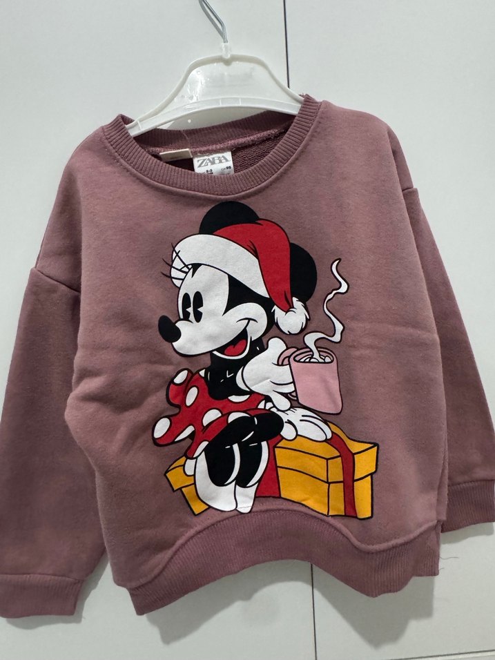Tek beden ihtiyaçtan satılık.Renkli pembe kız çocuk sweatshirt, uzun kollu, bisiklet yaka ve bol kesimdir. Yumuşak örme kumaştan yapılmış,baskılı Minnie Mouse figürlü sokak stili için uygundur