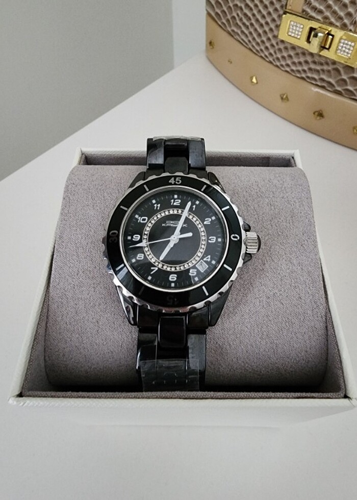 Çok az kullanıldı. Orijinaldir. Kolçaklari seramikten yapıldığı için biraz ağır bir üründür. Hem saati hem günü gösterdiği için kullanımı keyifli. Üstündeki halka hareket ediyor istediğiniz gibi kullanabilirsiniz. Seramik özel bir üründür replikalarla kıyaslamayınız.