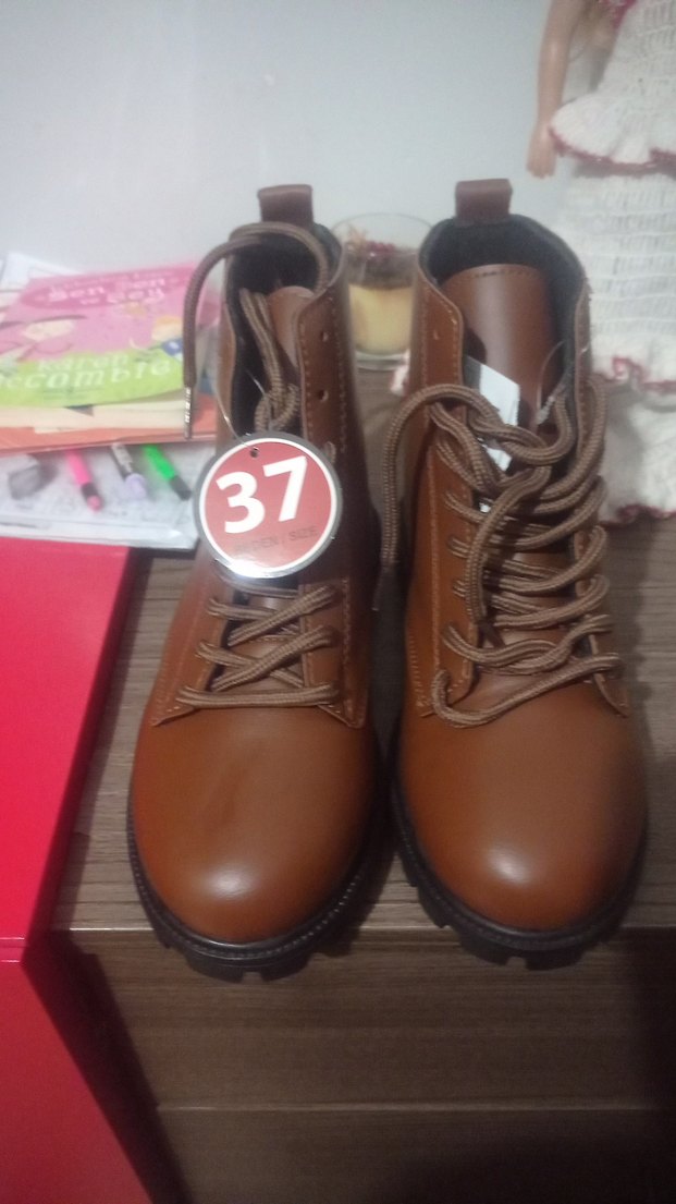 kahverengi deri bayan botları, kemer detaylı ve bağcıklı tasarıma sahip. 37 numara. Rahat günlük sokak stili için uygun.