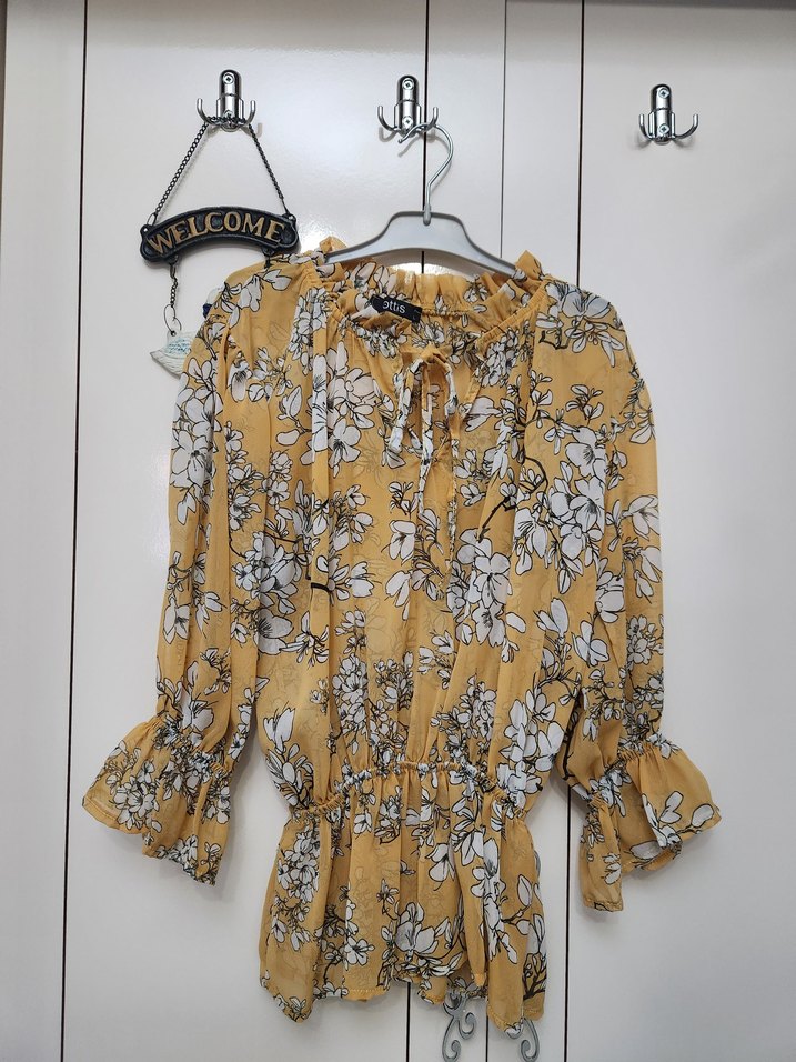 Sarı renkli, uzun kollu, volan detaylı ve çiçek desenli bol kesim bluz. Straplez yakaya sahip, yumuşak şifon bir gün giyildi astarsiz son fiyatir