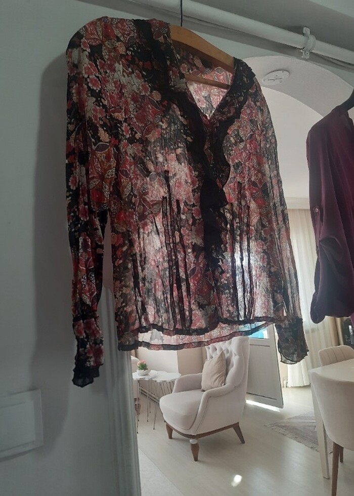 ÇOK ŞIK ŞİFON GÖMLEK MÜRDÜM RENGİ AĞIRLIKLI YAKA SİYAH ŞİFON KOLLARIN KISMINDA SİYAH ŞİFON VAR