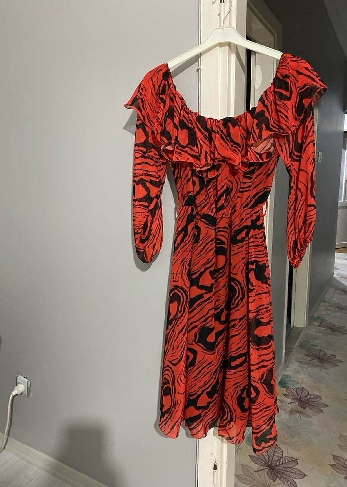 Şifon güzel bir elbise. İster düşük omuzla, ister yukarda kullanılabilir. Kemeri mevcut değil. Renk nar çiçeği.