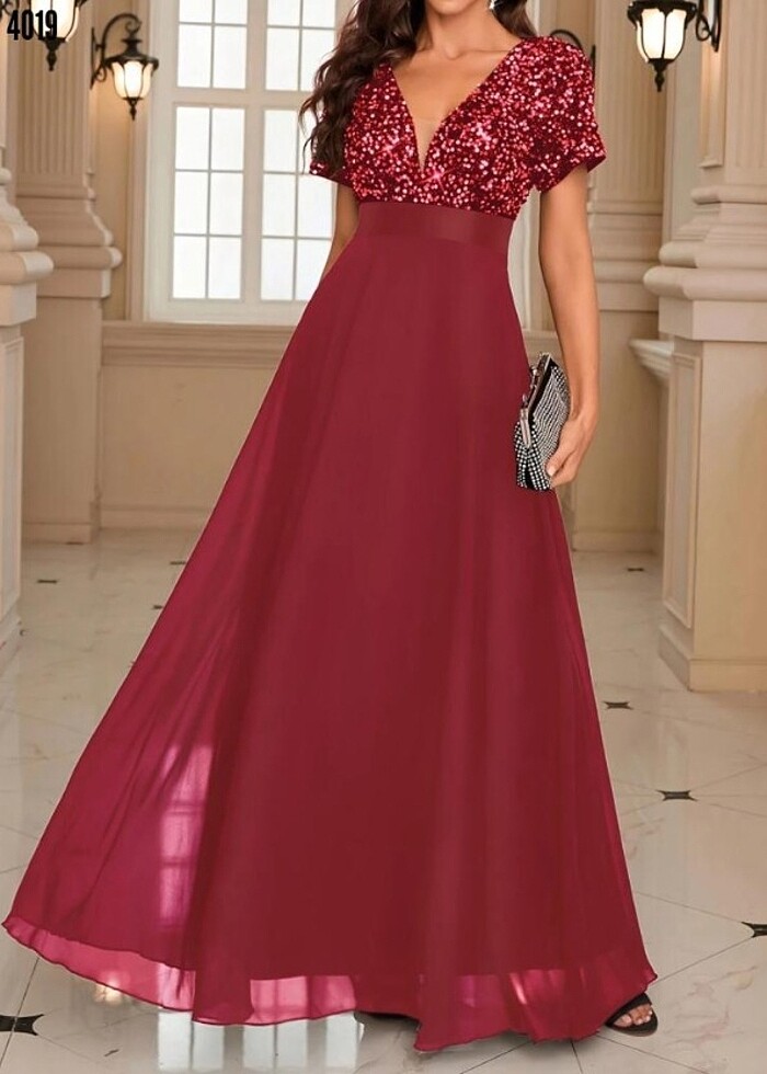 Kadın kısa kollu derin v yakalı a kesim pulpayet detaylı şifon nedime elbisesi Beden: S-M/L-XL/2XL-3XL Kumaş: ŞİFON
