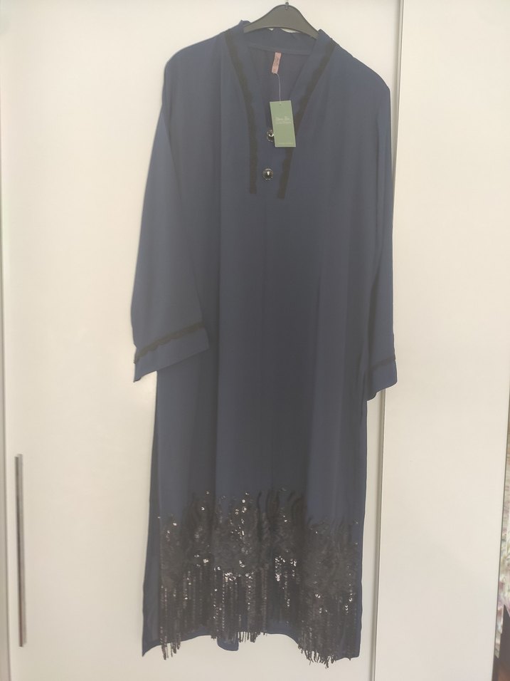 yeni etiketli ürün bedeni astarlı kolları astarsız şifon etek ucu payetli boy 118 koltuk altı 57