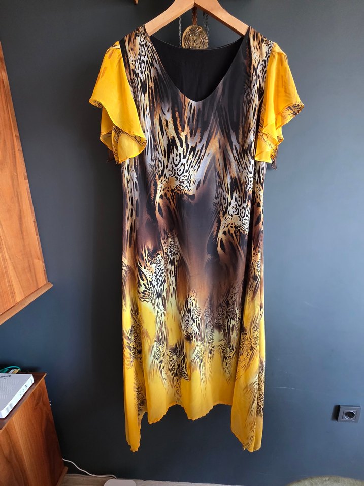 Sarı renkli, V yakalı, salaş kesim, kollari yırtmaçlı, şifon elbise günlük kullanım için uygundur.