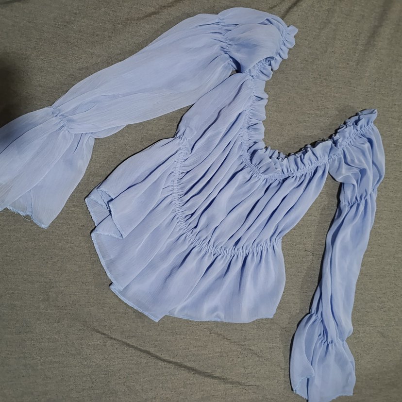 Açık mavi şifon kumaştan, fırfırlı, kayık yaka ve uzun kollu crop bluz