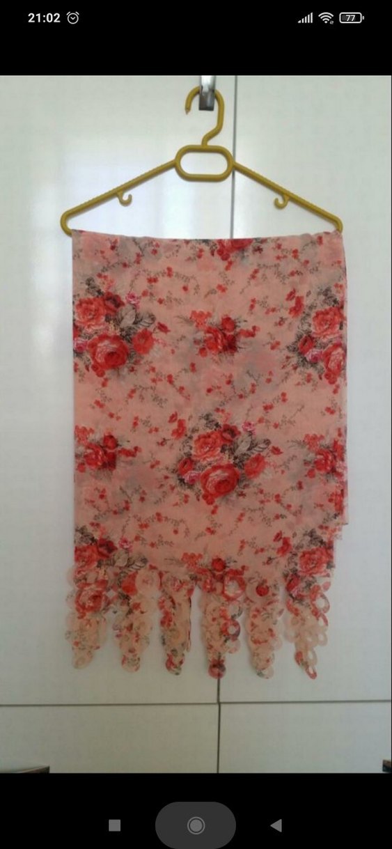 uçları lazer kesim,önü güzel durabilen ince şifon şal .somon rengi ve narçiçeği karışık bir renktir
