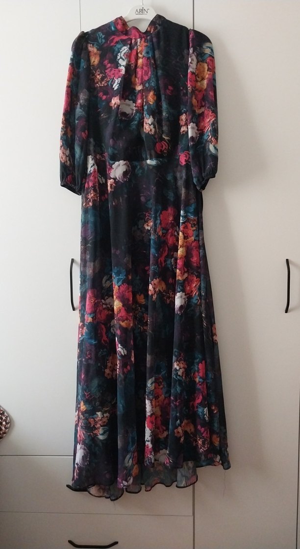 renkli büyük çiçekli şifon elbise. yalnız 3 kez giyildi. Hem günlük kullanım için hem de şık davetler için uygun. mor kuşağı var. herhangi bir yerinde yırtık veya sökük bulunmuyor. yanında fermuarı var. 42 beden yazıyor ancak dar kalıp olduğunu belirtmek isterim.