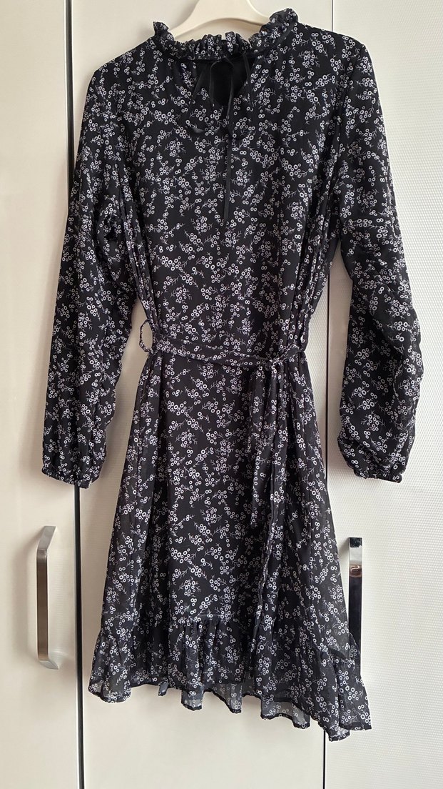siyah sifon cicekli diz boy uzun kollu elbise