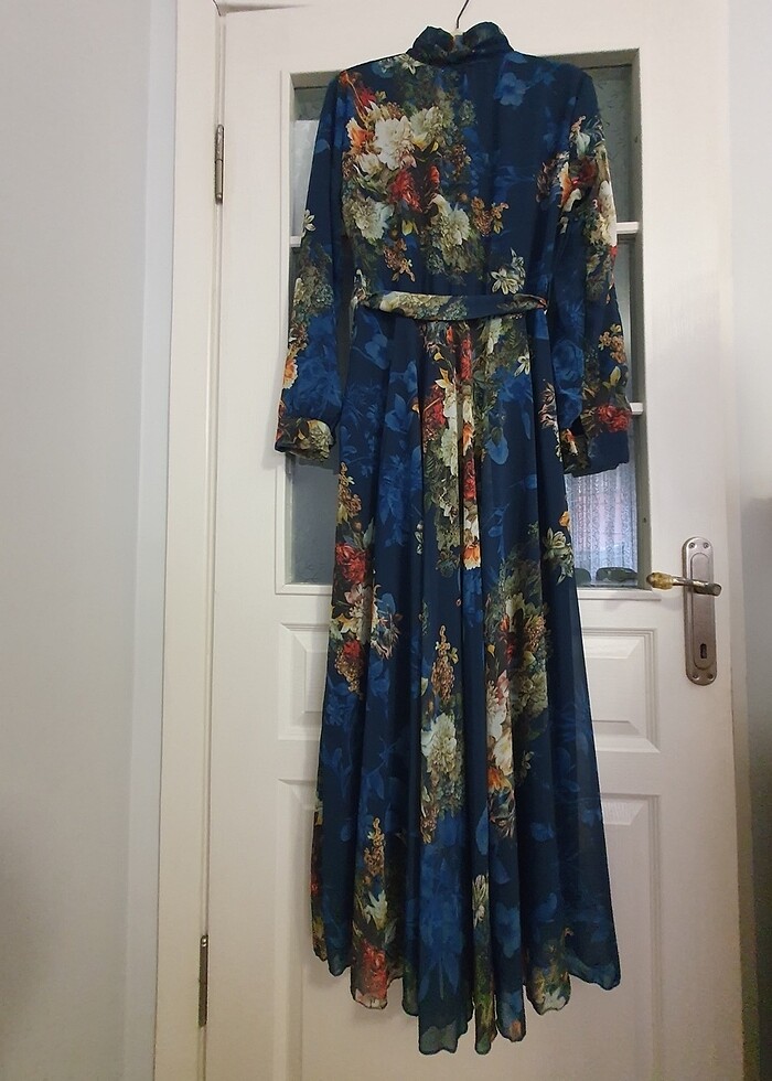 Şifon uzun astarlı, önden düğmeli, yandan fermuarlı Beden 42 Boy 142 cm Göğüs altı 50 cm Bel 44 cm