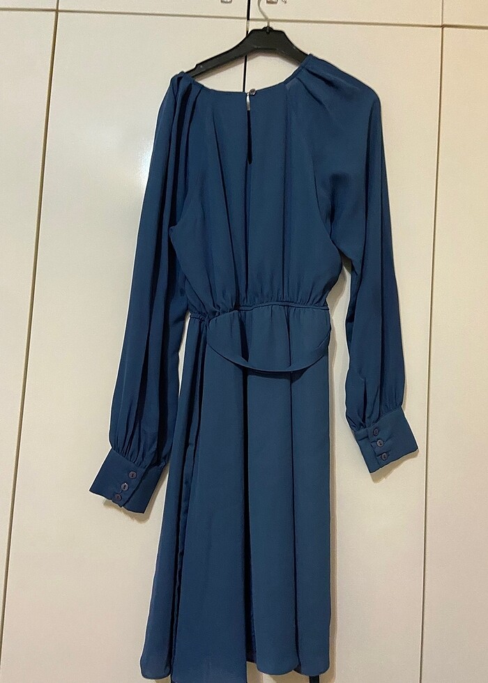 Karpuz Kol Parlement mavisi Oversize yaka Kemerli Midi boy Şifon elbise Mevsimlik