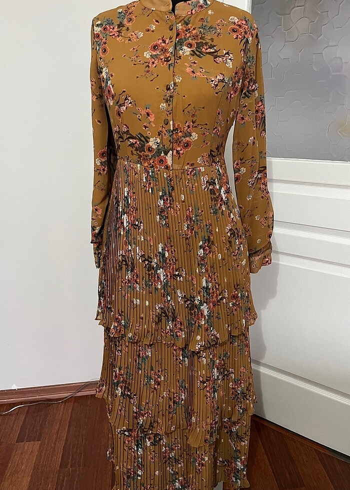 Üç kat piliseli şifon elbise, içi kolları da dahil tamamen astarlı