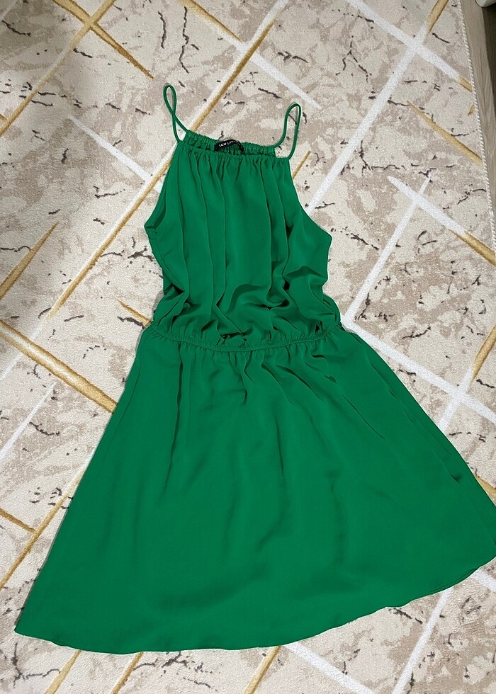 askılı yeşil şifon beli lastikli tül elbise