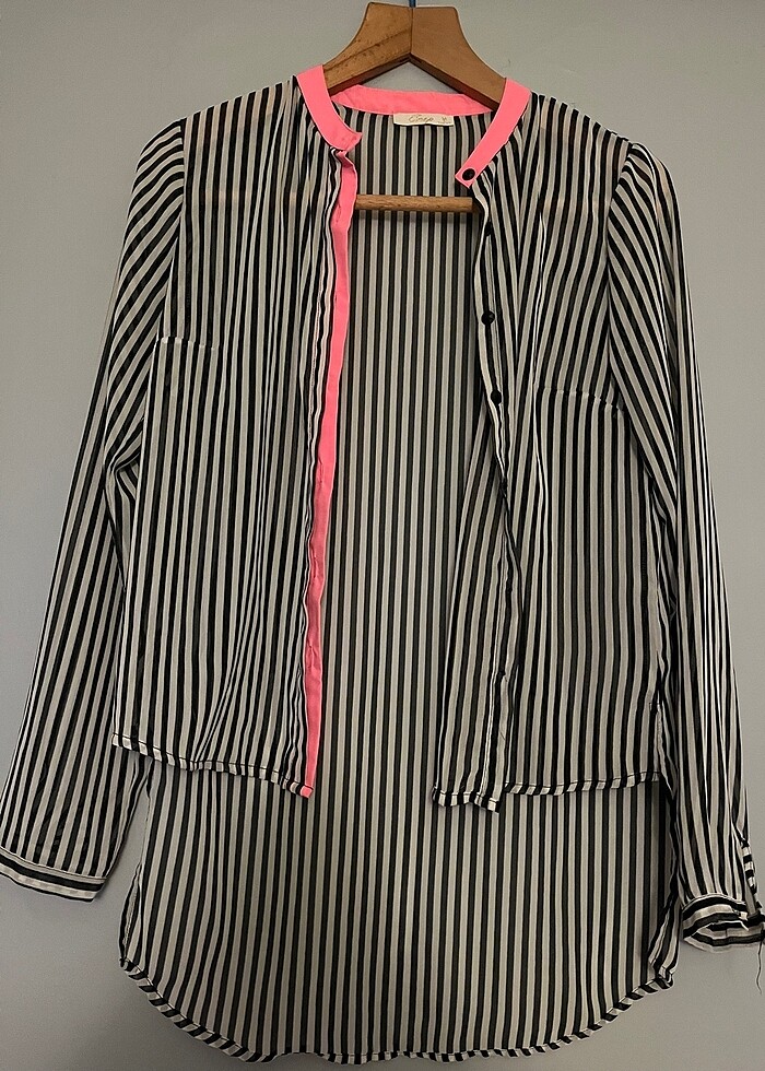 Siyah beyaz çizgili önden düğmeli rahat şifon gömlek. Asimetrik kesim, önü kısa arkası uzun. Hakim yaka
