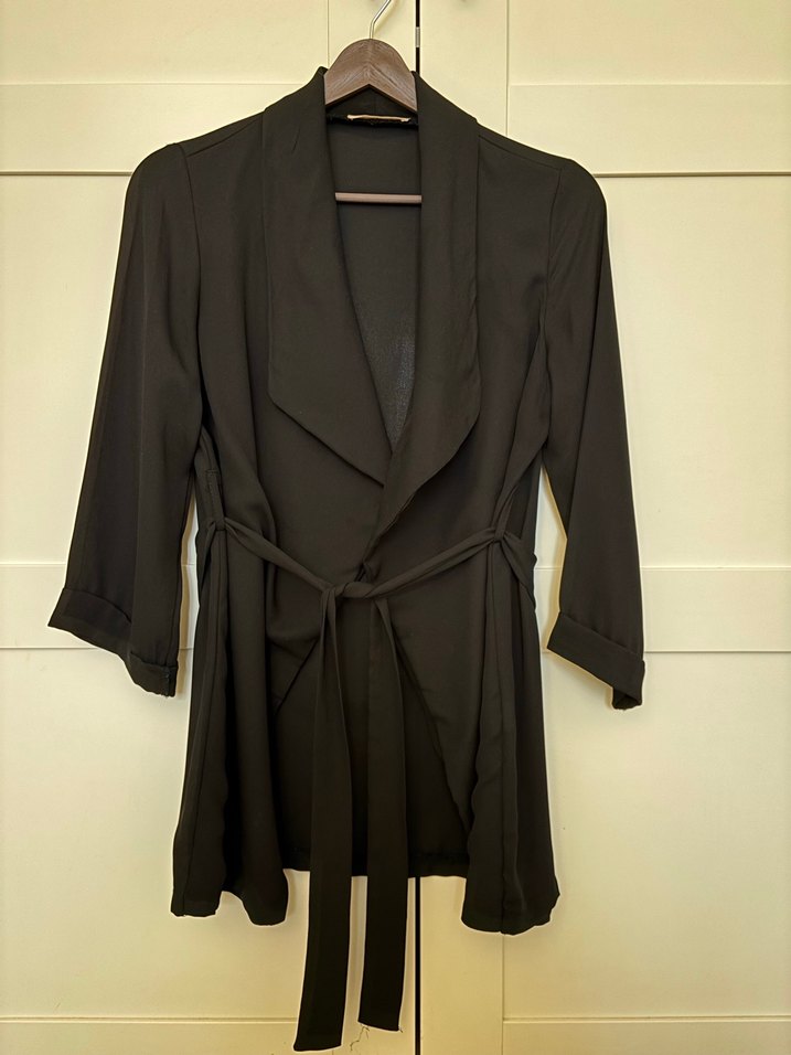 S beden İki koltuk arası 47 cm Uzunluk 63 cm Kemerli şifon siyah ceket, klasik ve şık görünümlüdür. Midi boyda, rahat kesimdir. Kolları aslında uzun ama ben son fotoğrafta görüldüğü gibi içten çok hafif diktim onu. İsterseniz sökebilirsiniz. Ön kısmı birkaç kat sifona sahip arka kısmı tek kat şifon.