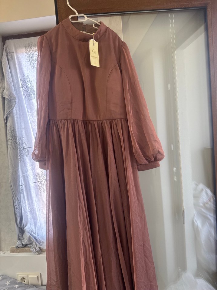 Vintage tarzında, kahverengi uzun elbise, yüksek yakalı ve uzun kollu,ipeksi kumaştan, bol kesim ve drapeli tasarıma sahip, düğün için uygun.
