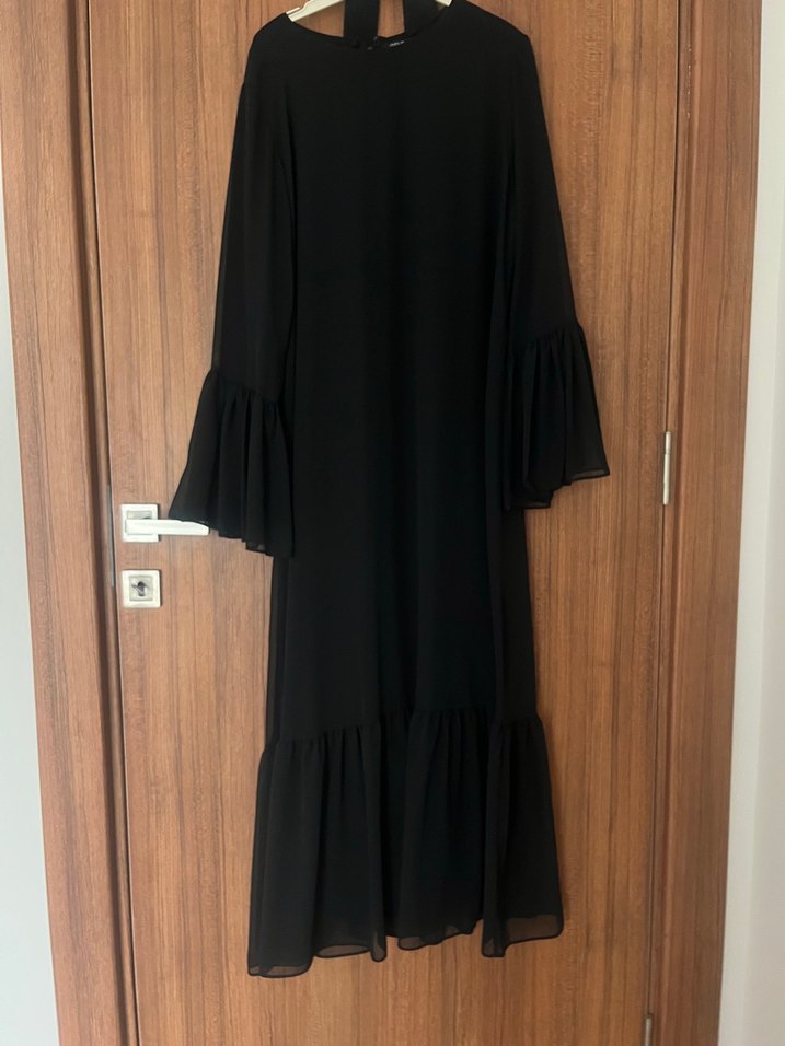 M beden Siyah uzun kollu, yüksek yakalı, fırfır detaylı ve bol kesim uzun elbise. Yumuşak sentetik kumaştan, ofis kullanımı için uygun.