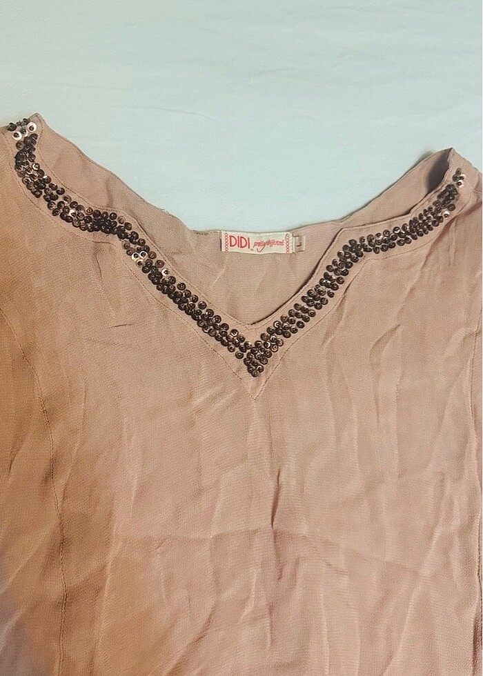 Şifon tunik/pareo . L beden. Koltuk altından eni 61cm, boyu 100cm. 3-4 kez giyilmiştir. Minik defoları var. Minicik ip çekilmesi var. Yine tırnak ucu kadar kumaş genişlemesi var. Rengi ilk fotoğraftaki gibi. Diğer fotoğrafta rengi farklı çıkmıştır.