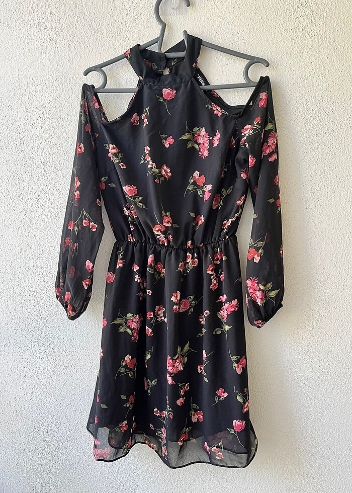 Hiç kusuru yok Kolları tüllü omuzları açık çiçekli yazlık elbise