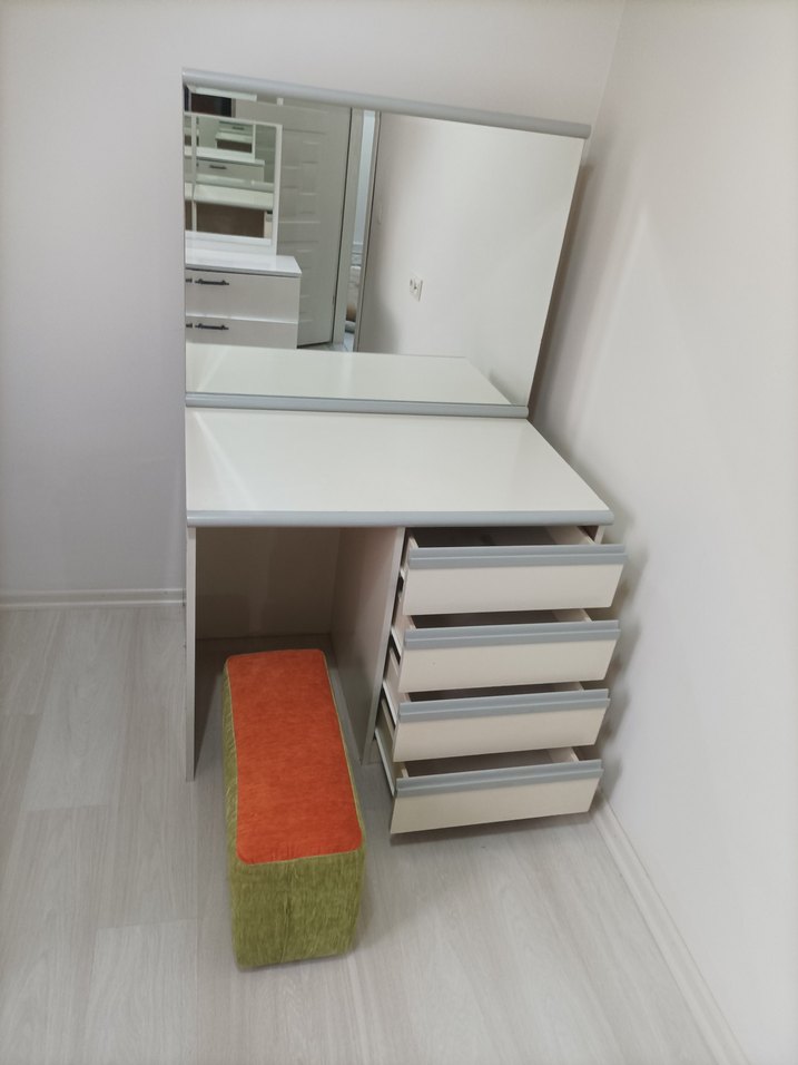 Beyaz şifonyer, büyük aynası ve dört çekmecesi ile birlikte yeşil ve turuncu kumaşlı küçük bir puf içerir. Temiz ve açık tasarıma sahiptir. aynalı komidin dört çekmeceli herhangi bir sıkıntı yok gelip evde bakabilirsiniz evde yerim olmadığı için ve ihtiyaç fazlasından kaynaklı satılacaktır bilgi için lütfen mesaj atınız diğer ilanlara profilimden bakabilirsiniz.