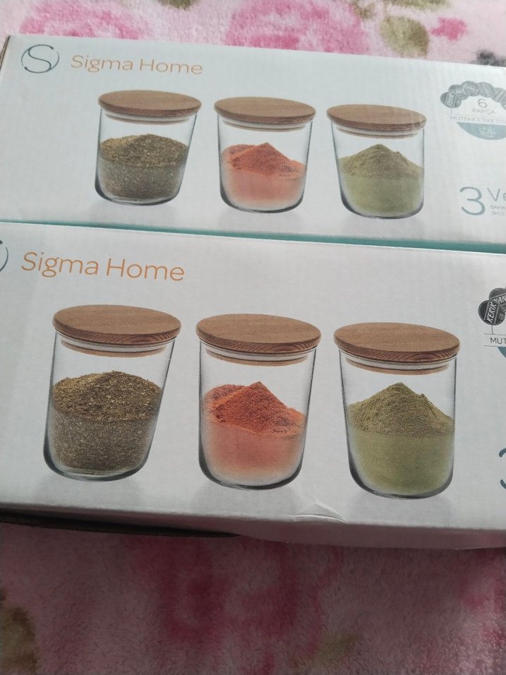 Sigma Home marka, kapaklı üçlü cam baharat kavanozu seti. Baharat ve otları saklamak için uygundur.