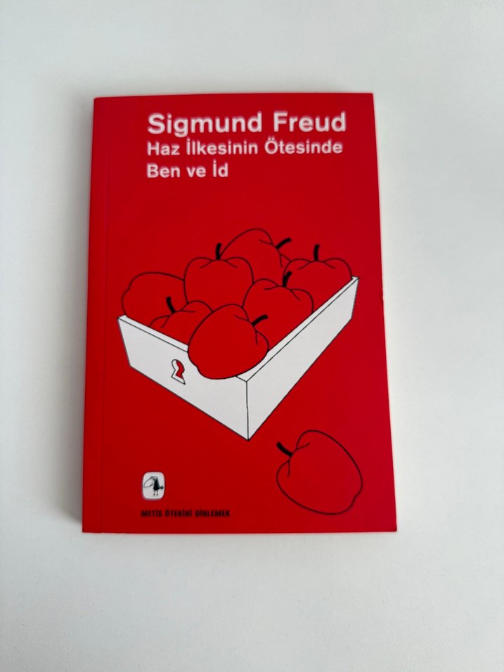 Sigmund Freud'un Haz İlkesinin Ötesinde, Ben ve İd konularını ele alan kitabı. Kapağında kutuda ve kutu dışında elma çizimi var.