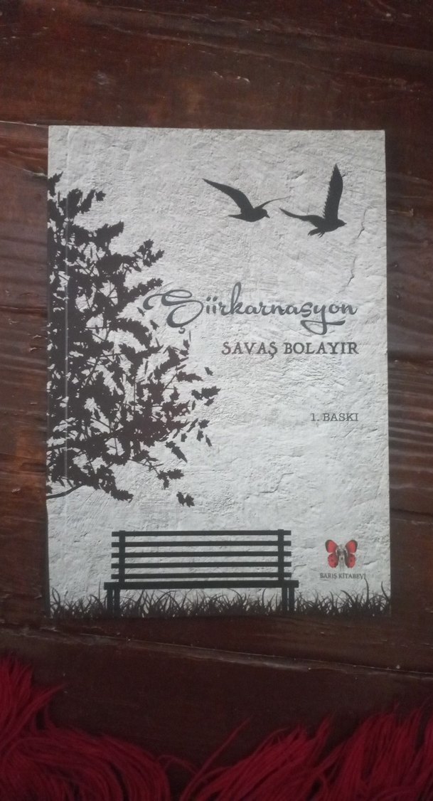 Savaş Bolayır'ın "Şiirkarnasyon" adlı şiir kitabı, kuşlar ve banka çizimiyle sade bir kapak tasarımına sahiptir. 1. baskıdır.
